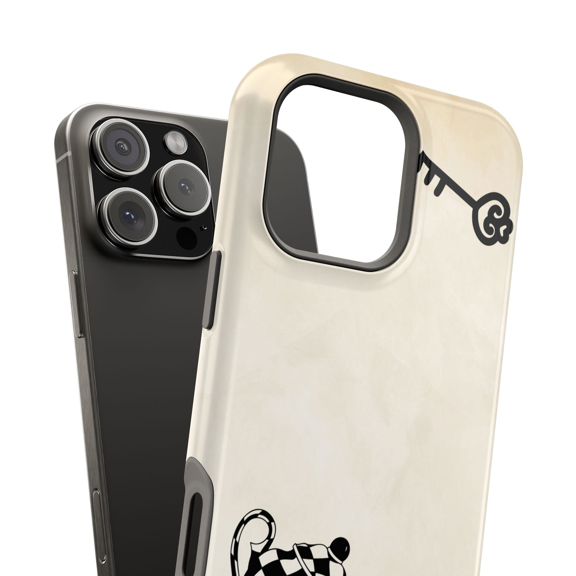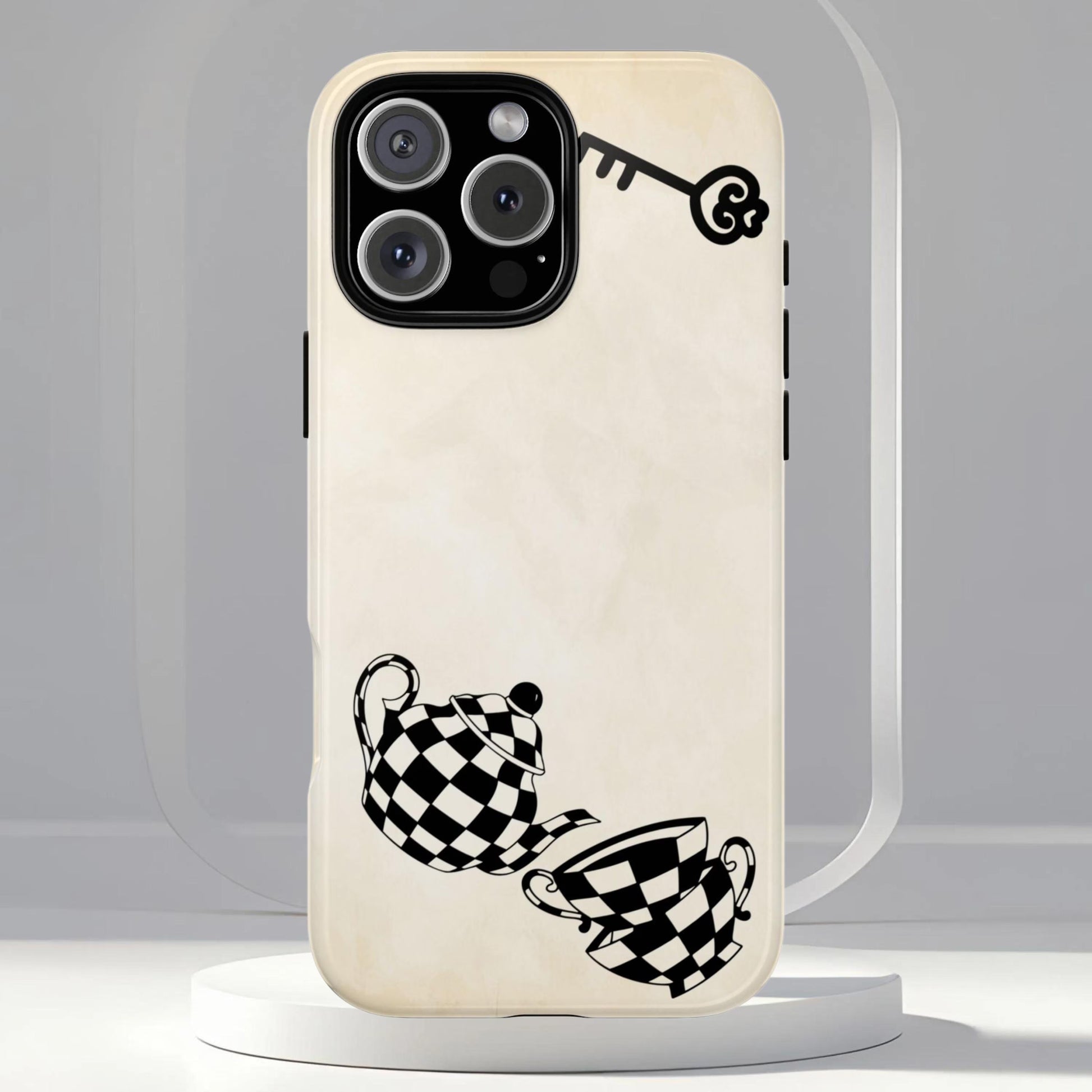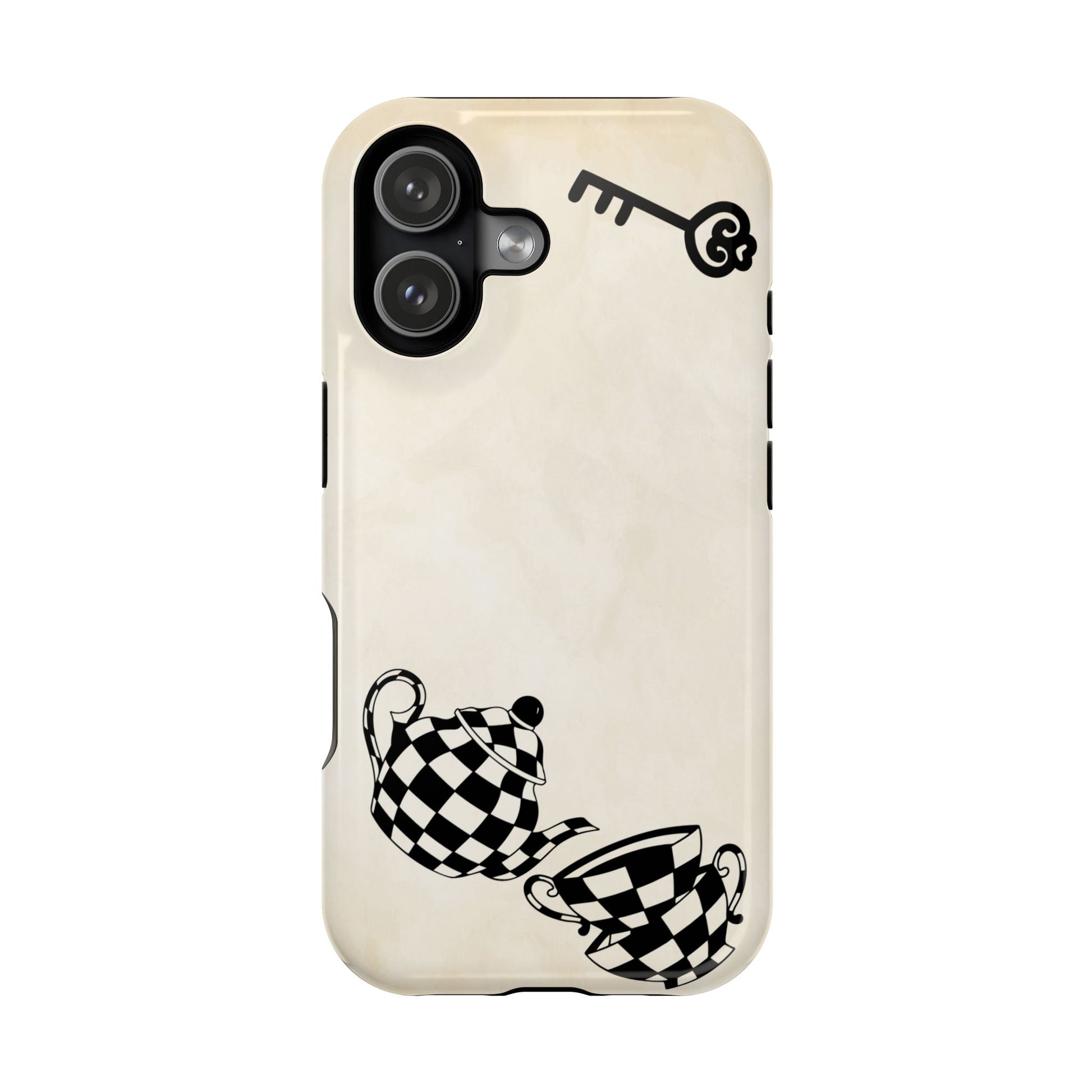 Looking for a magnetic phone case with a vintage Alice in Wonderland aesthetic? This design features a checkerboard teapot, whimsical teacups, and a classic storybook key—great for Wonderland gifts, tea party lovers, and anyone who enjoys playful nostalgic art.
