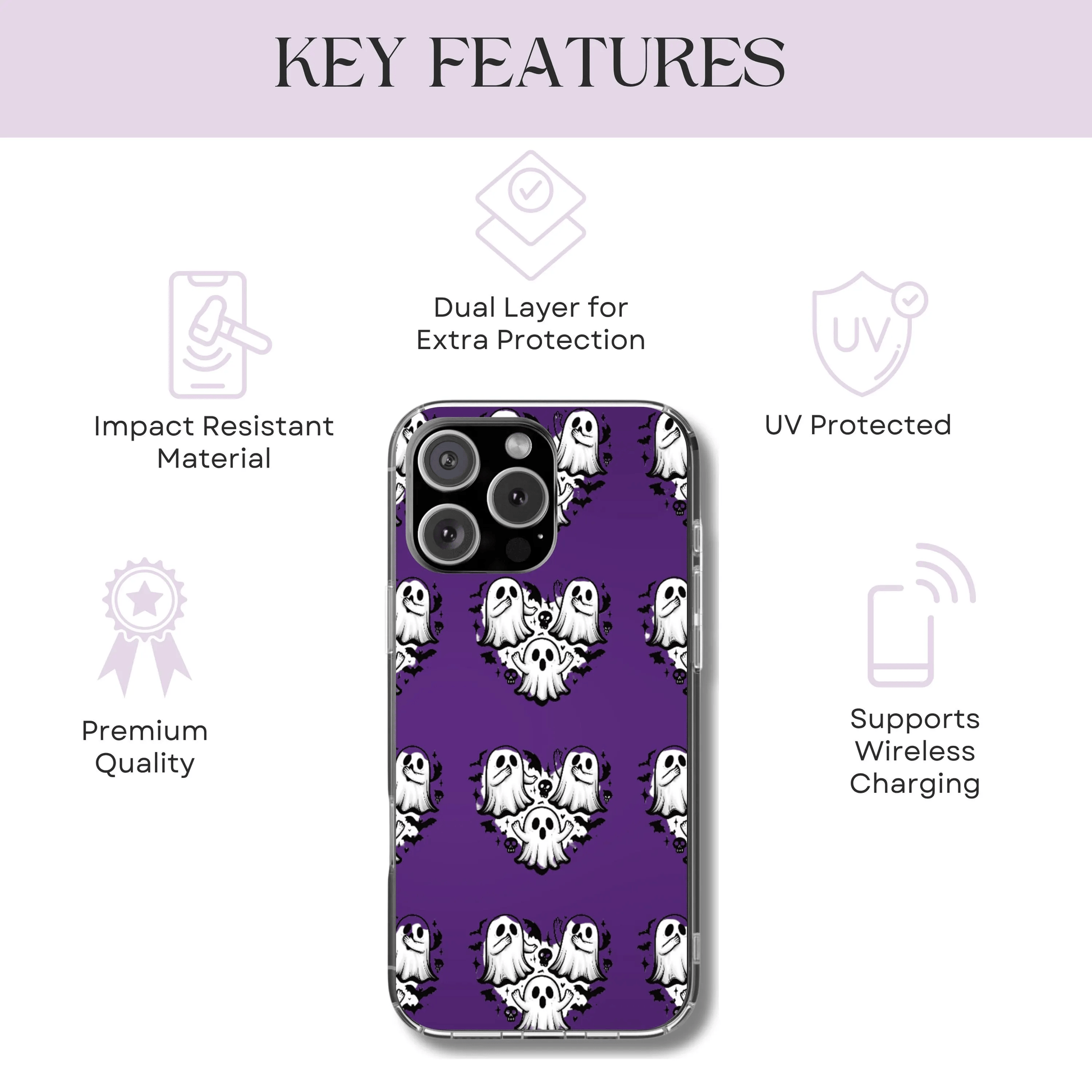 Unleash your spooky side with this Cute Ghost Heart Tough Phone Case. Featuring a trio of adorable cartoon ghosts surrounded by bats and spooky sparkles, this bold purple background adds a fun pop of color with major Halloween flair. Perfect for pastel goths, spooky girls, or anyone who lives for cute-meets-creepy vibes, this case is the ultimate accessory for haunted hearts.