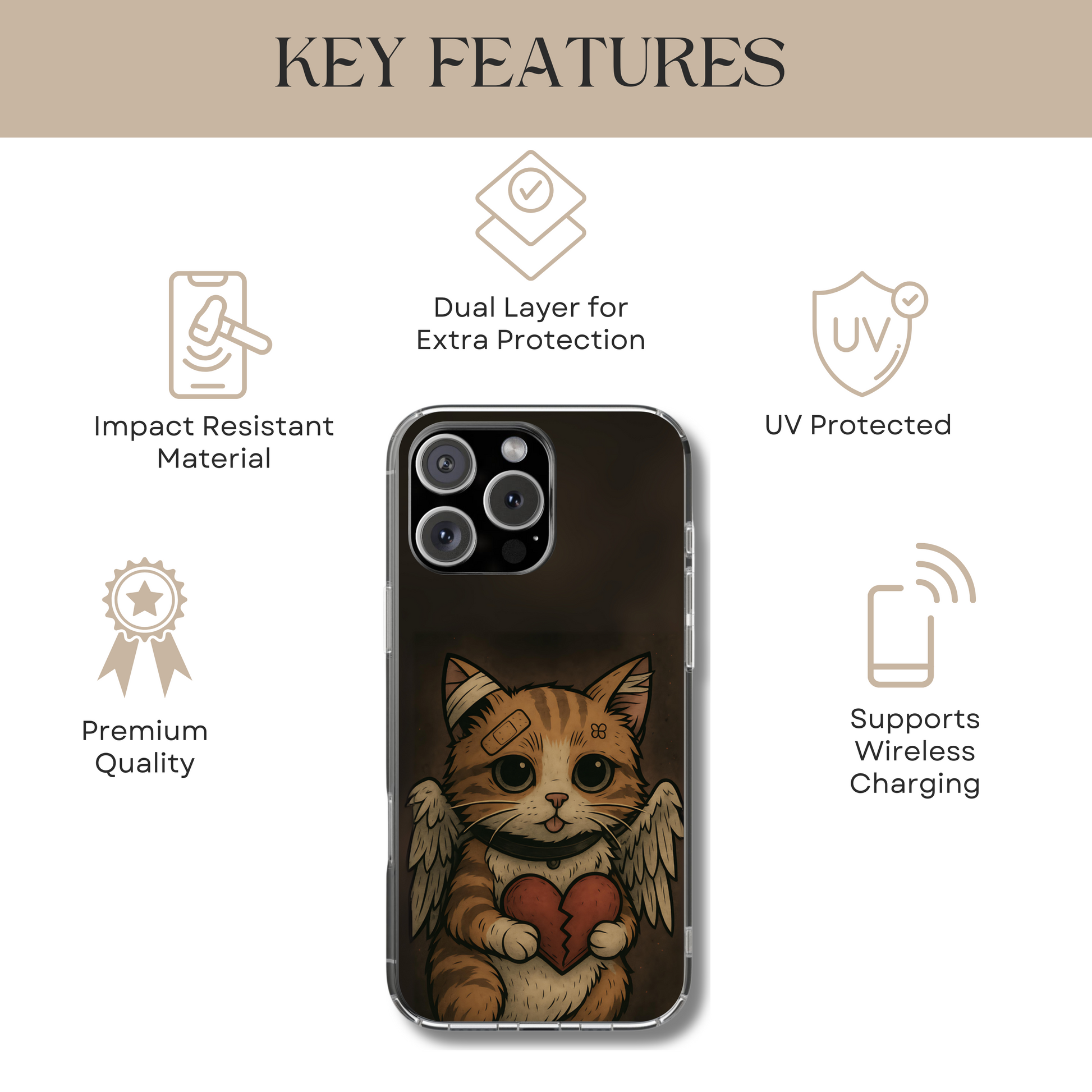 This emo-inspired phone case featuring a wide-eyed anime cat holding a cracked red heart. With angel wings, tiny bandages, and moody muted tones, it’s a statement piece for heartbreak, healing, and self-expression. Perfect for alt-style lovers, scene-core fans, and anyone who wants their phone case to tell a story as unique as they are. Both protective and aesthetic it’s emo, kawaii, and unforgettable.