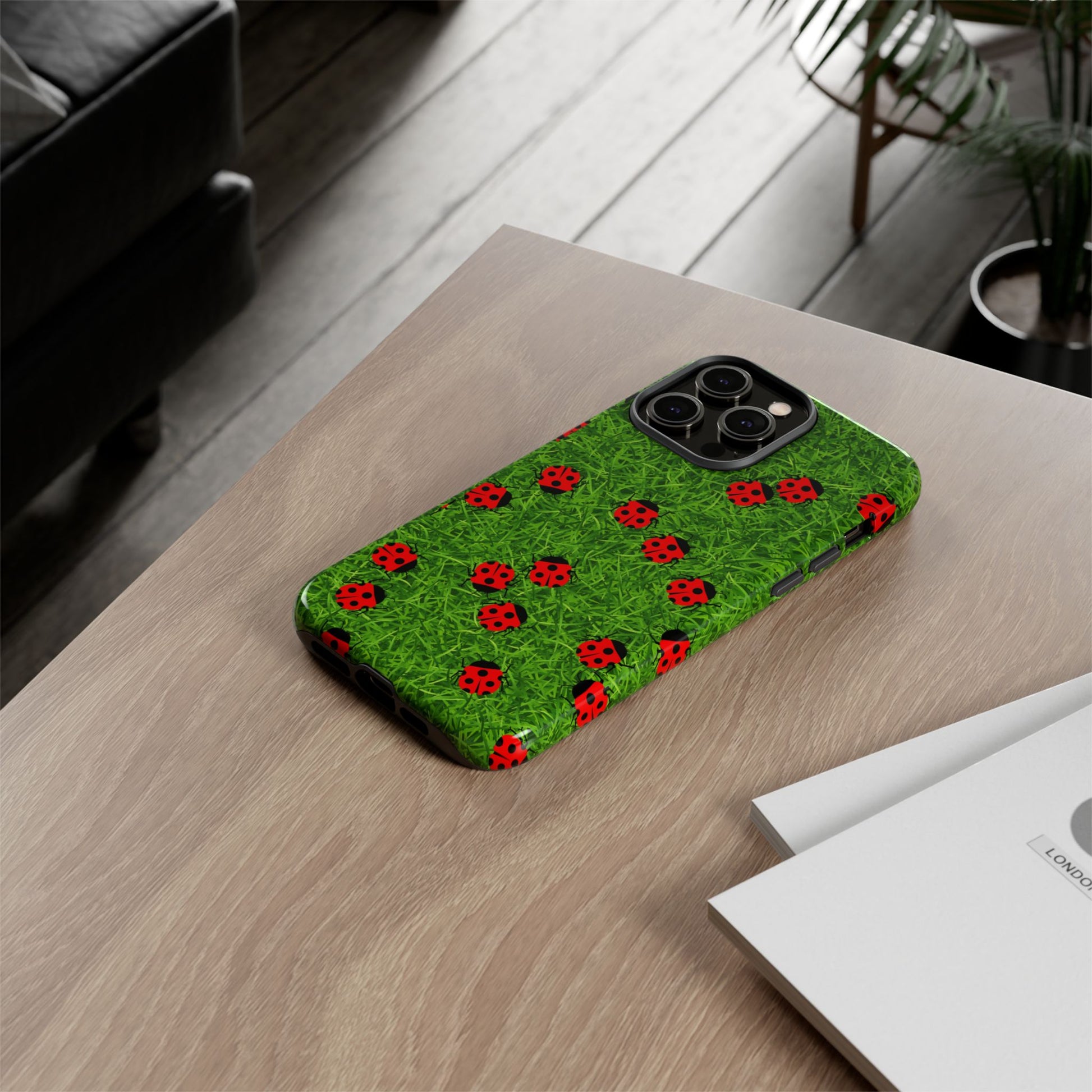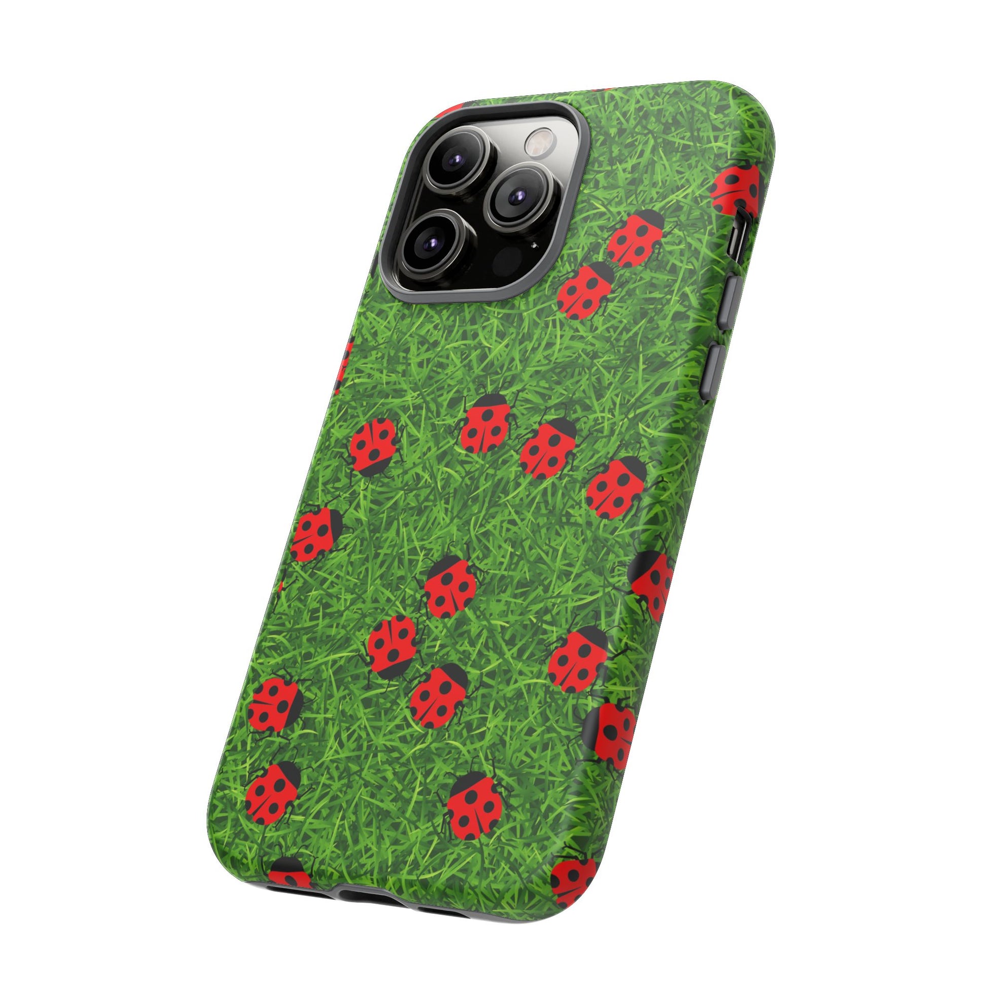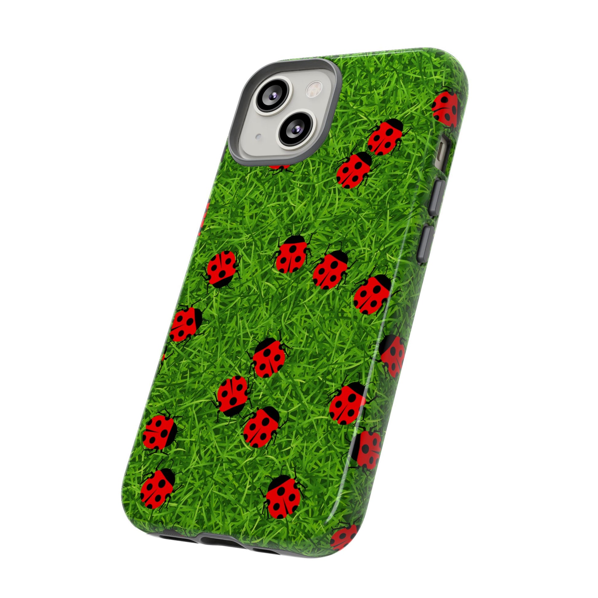 This charming tough phone case features a playful scatter of vibrant red-and-black ladybugs against a lush green grass background, bringing the charm of a sunny garden straight to your fingertips. Perfect for nature lovers and whimsical souls, it offers a durable build to keep your phone safe while showing off your love for these lucky little beetles.