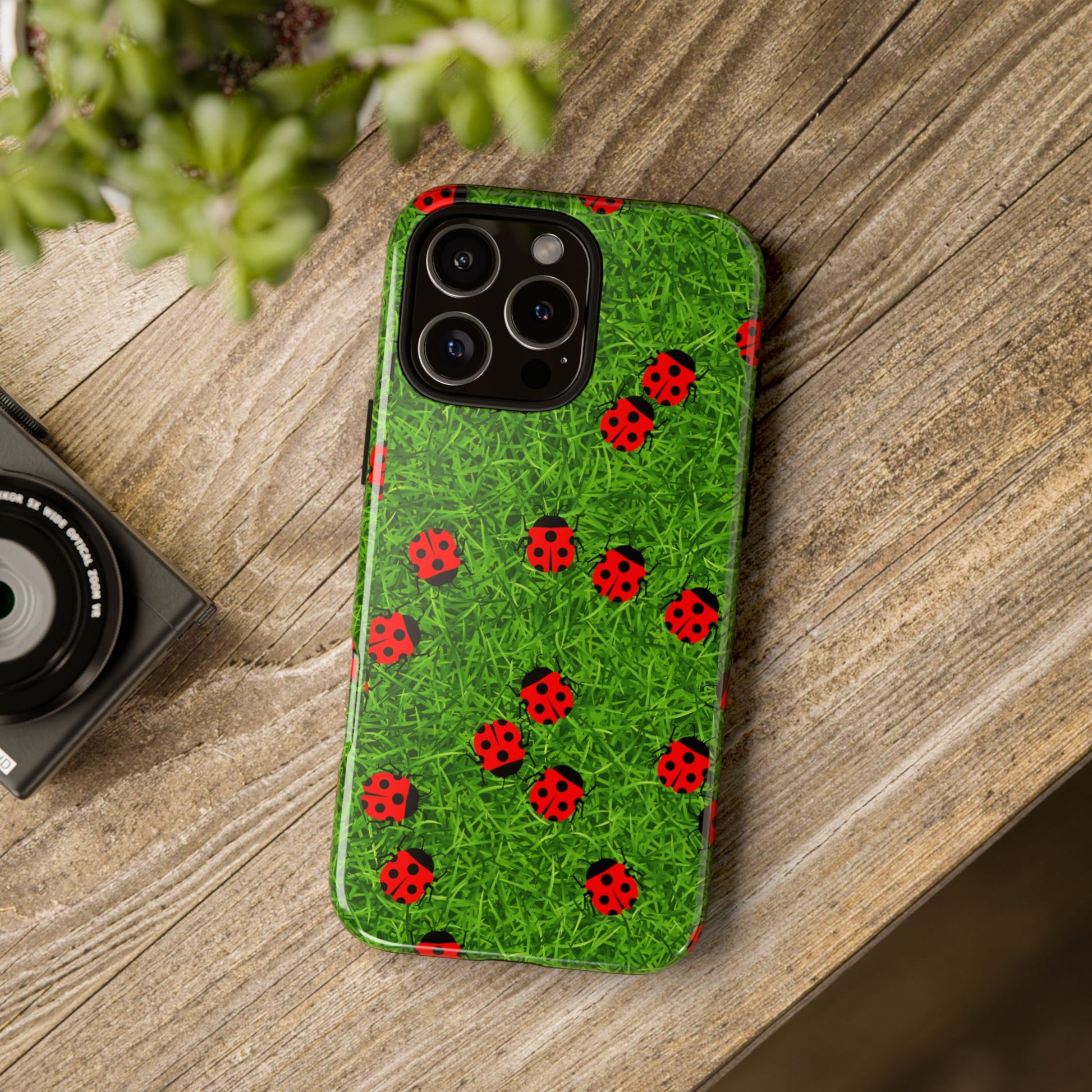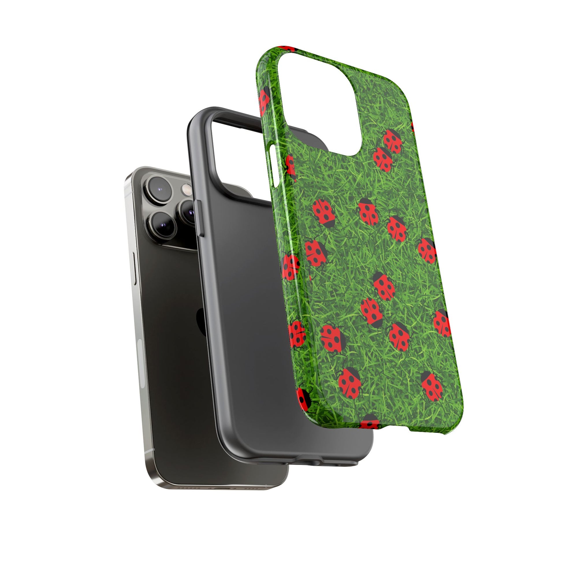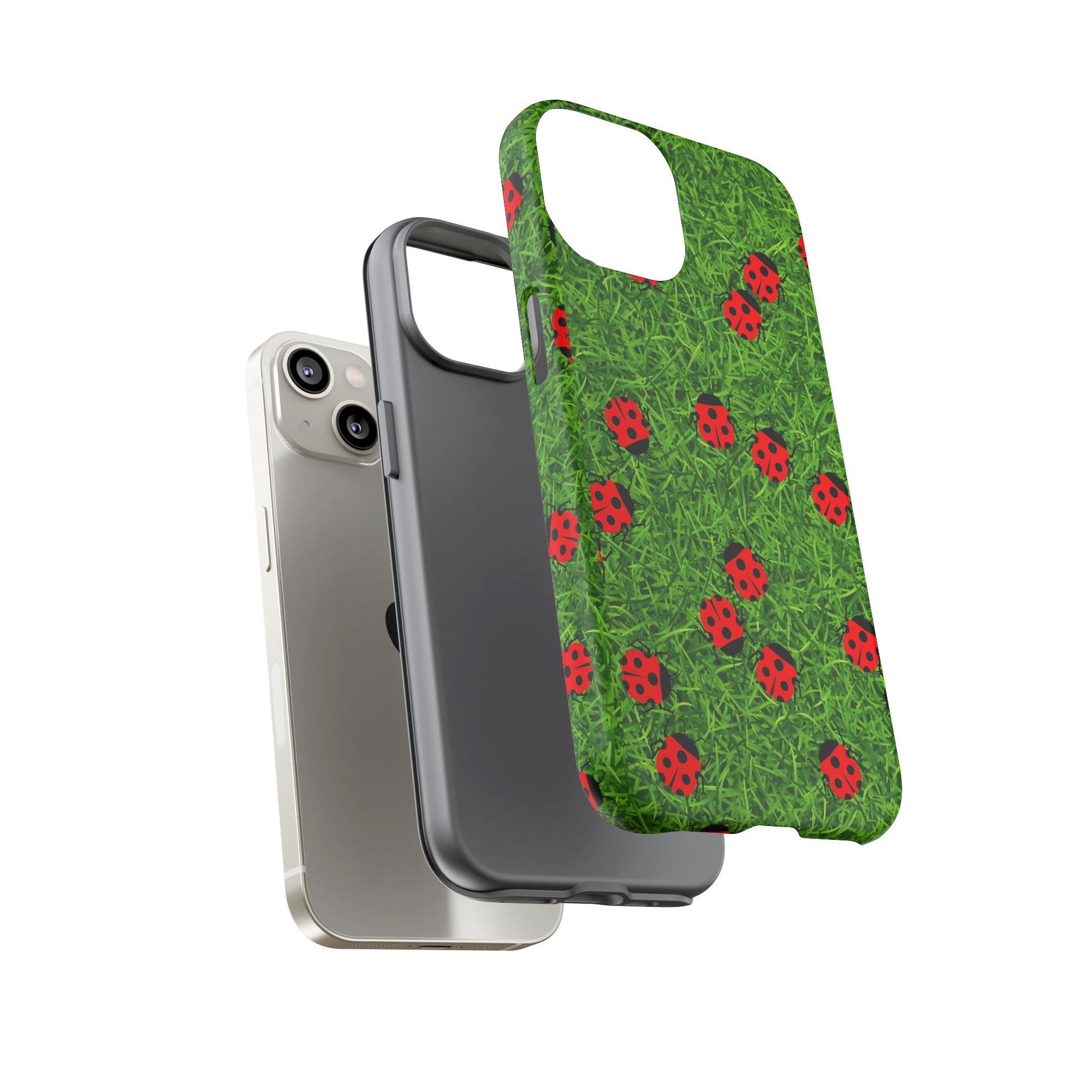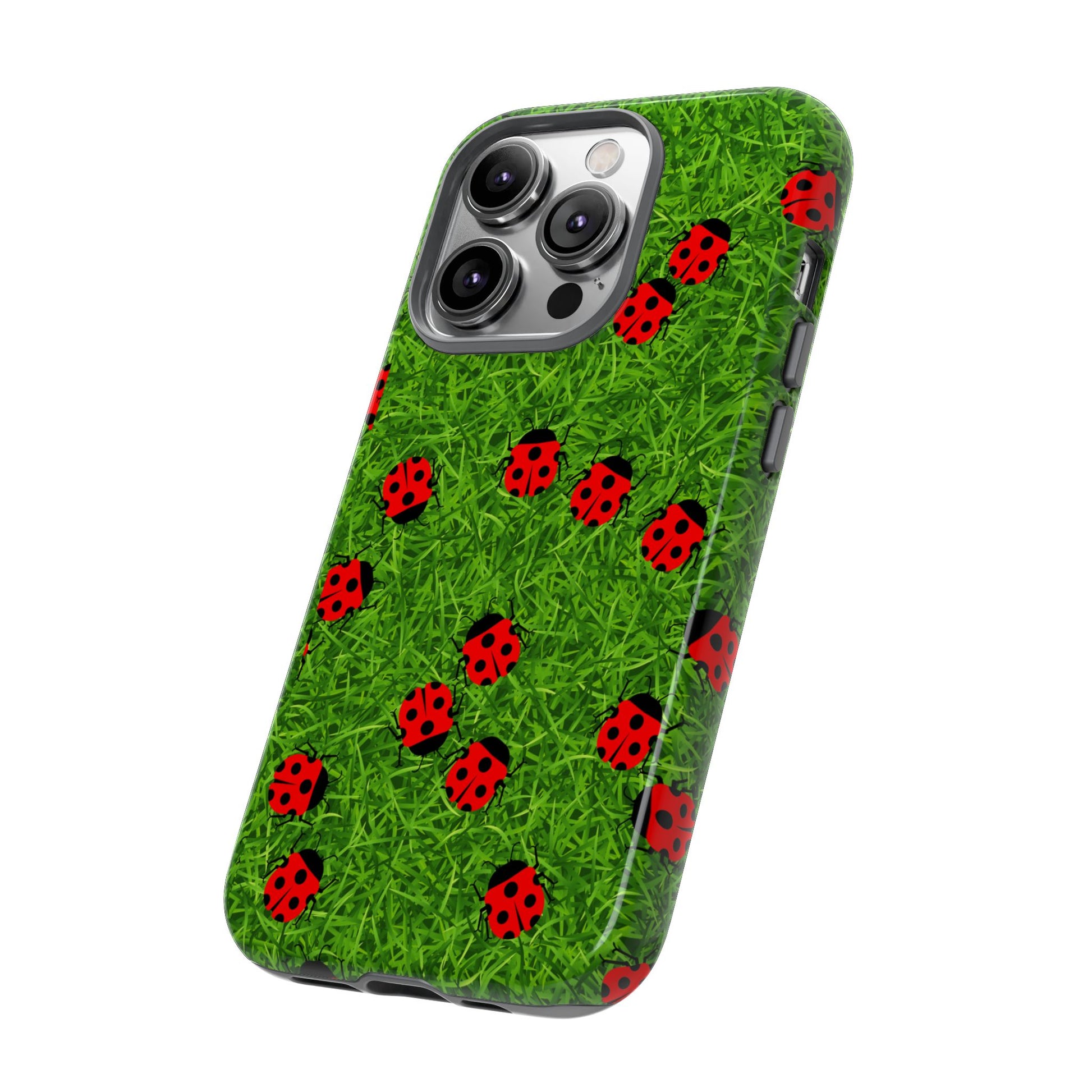 This charming tough phone case features a playful scatter of vibrant red-and-black ladybugs against a lush green grass background, bringing the charm of a sunny garden straight to your fingertips. Perfect for nature lovers and whimsical souls, it offers a durable build to keep your phone safe while showing off your love for these lucky little beetles.