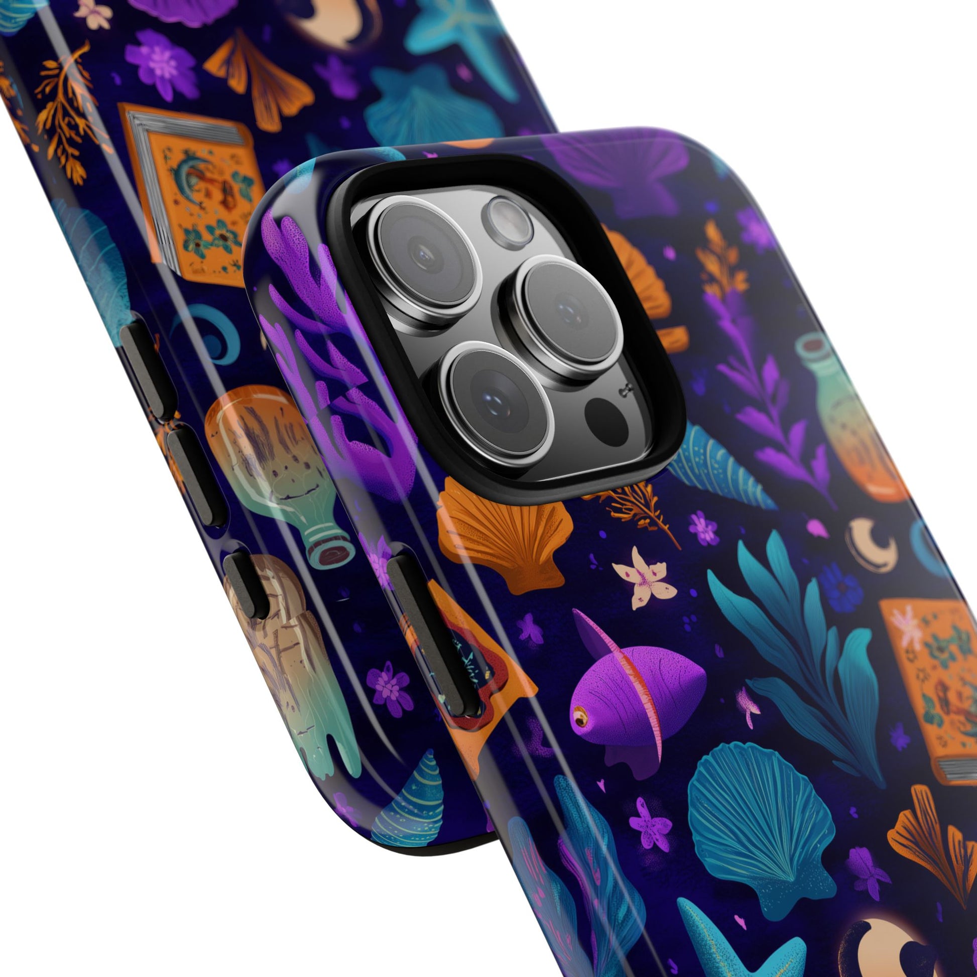 Dive into a mystical underwater world with this Magical Ocean phone case. Features seashells, starfish, sea plants, fish, crescent moons, and a spell book in vibrant purples, blues, and oranges. Blends witchy, celestial, and coastal vibes to create a unique and protective phone cover. Show off your magical sea style while keeping your device safe.