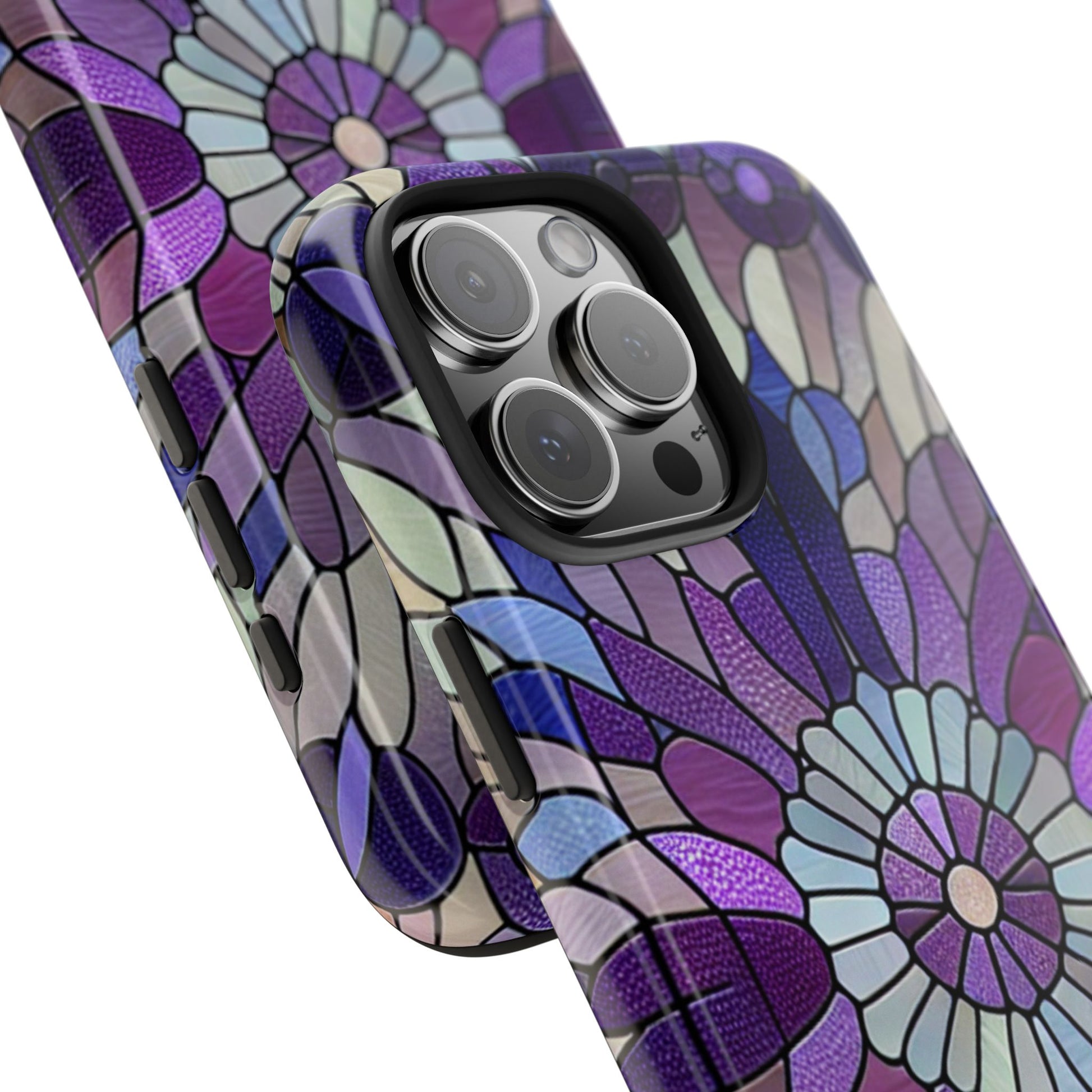 Give your phone a fresh burst of color with this Purple Stained Glass Floral Tough Case. Inspired by stained glass art, the delicate floral mosaic blends rich purples, soft lavenders, and shimmering accents creating a timeless, elegant look with modern durability. Whether you're heading to the office, school, or your next adventure, your phone will stay protected and beautiful.