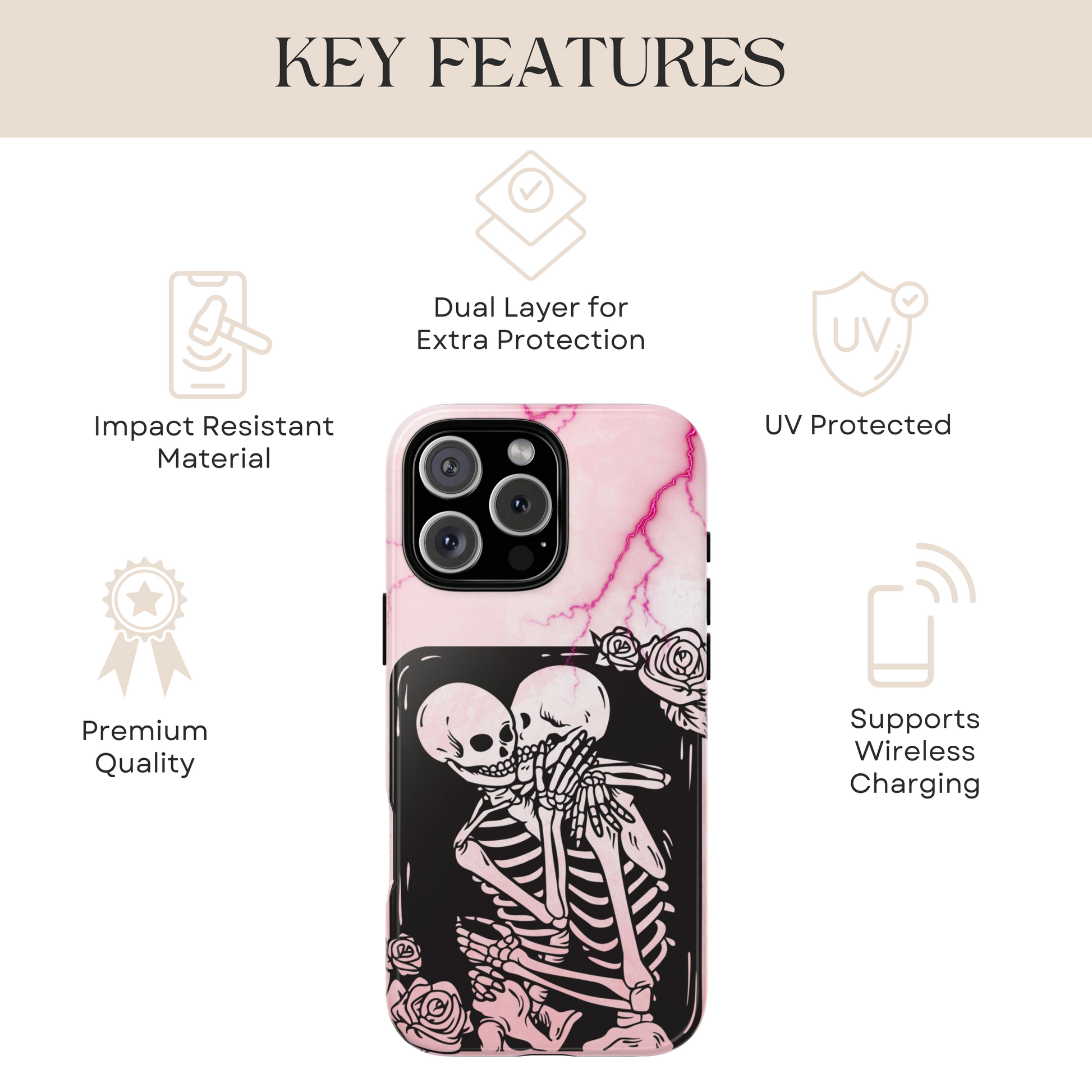 Celebrate love with a spooky twist! This skeleton lovers phone case features two entwined skeletons framed by roses on a dreamy pink marble background. Equal parts romantic and eerie, it's the perfect phone case for pastel goths, horror romantics, and anyone who loves eternal love with a little edge.