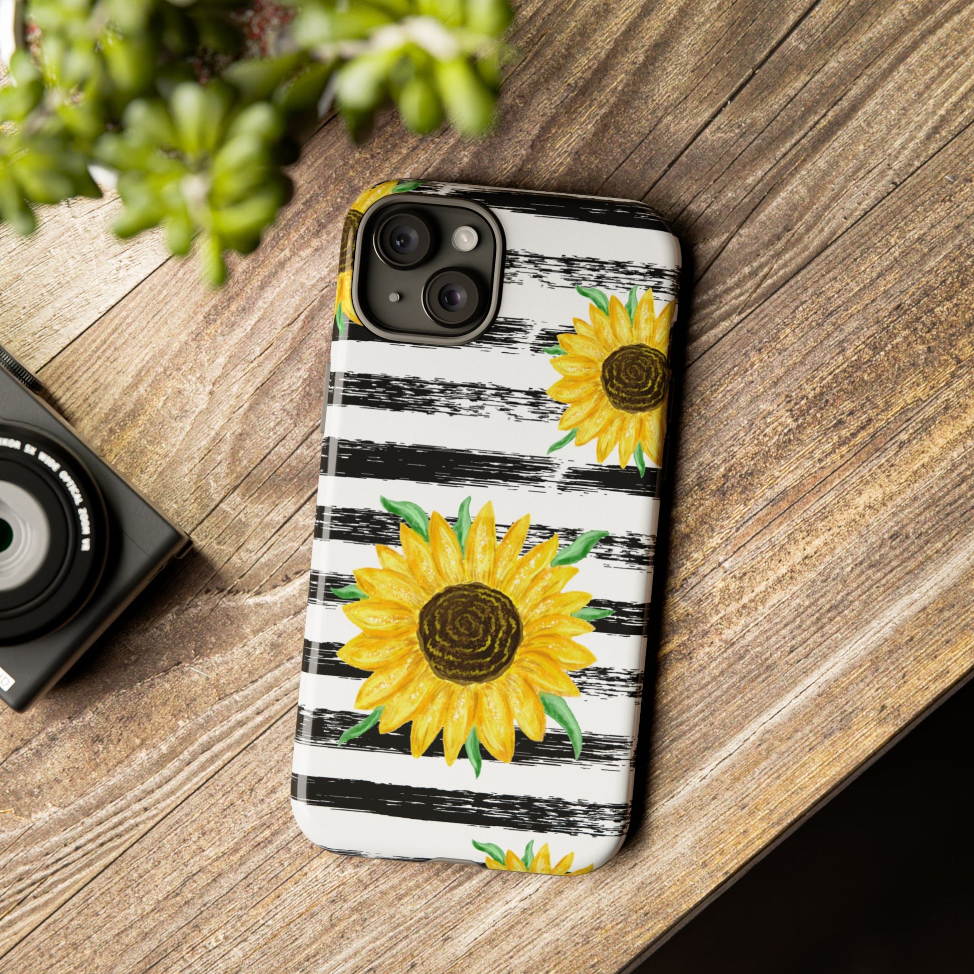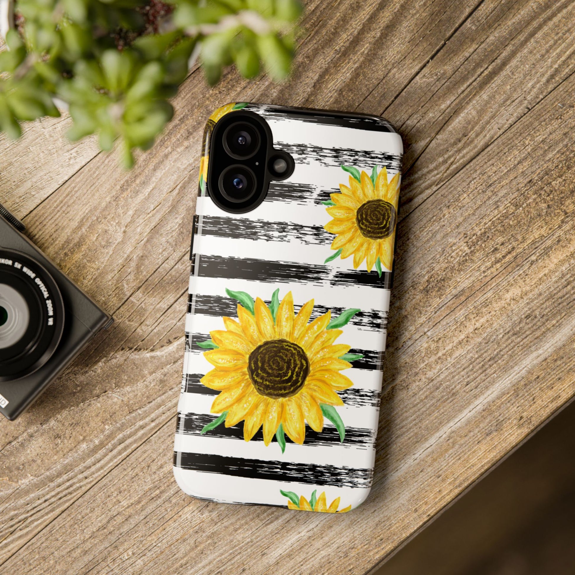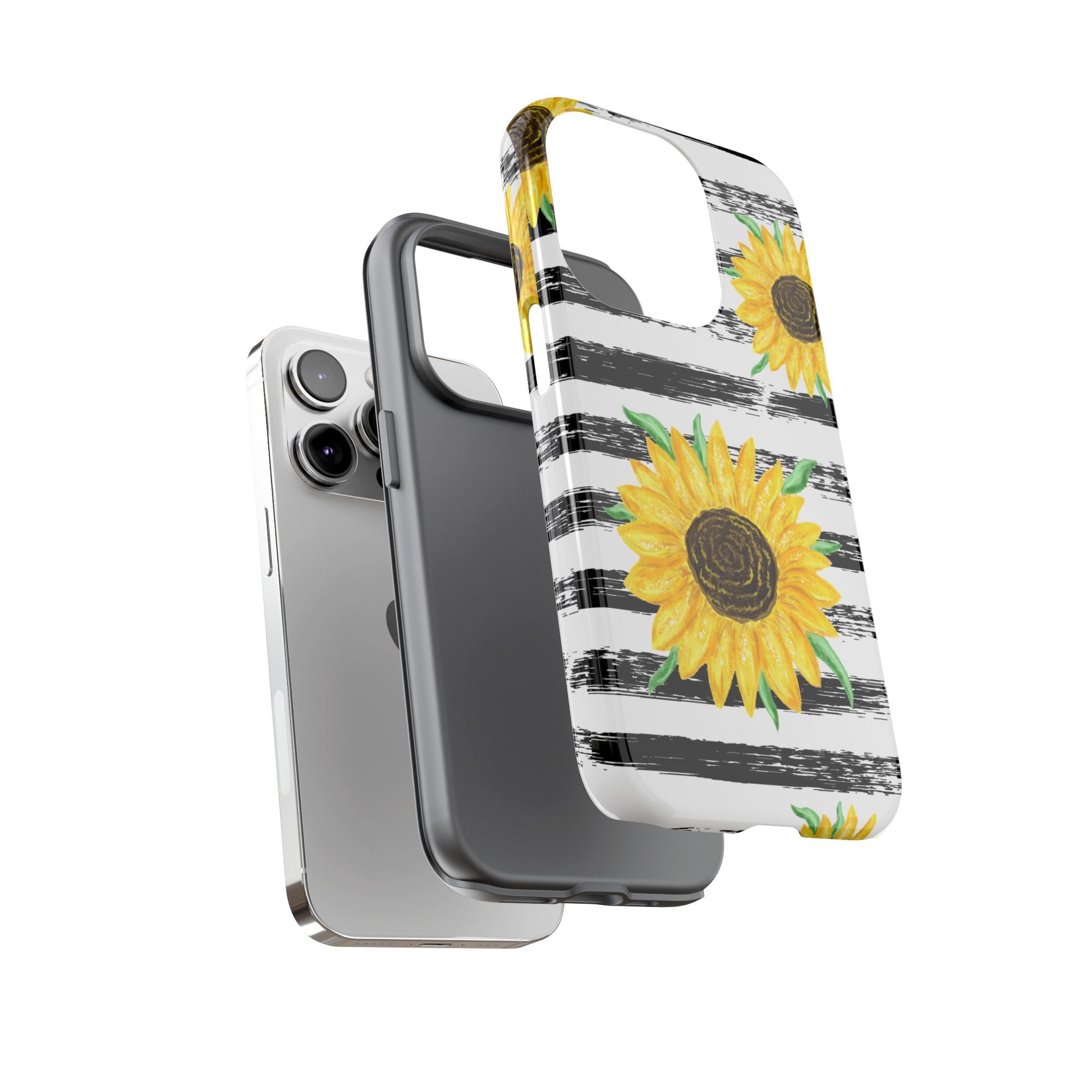 Sunflower Tough Phone Case - Bright Yellow Floral Art, Black and White Striped Aesthetic, Compatible with iPhone, Galaxy, and Google Phones
