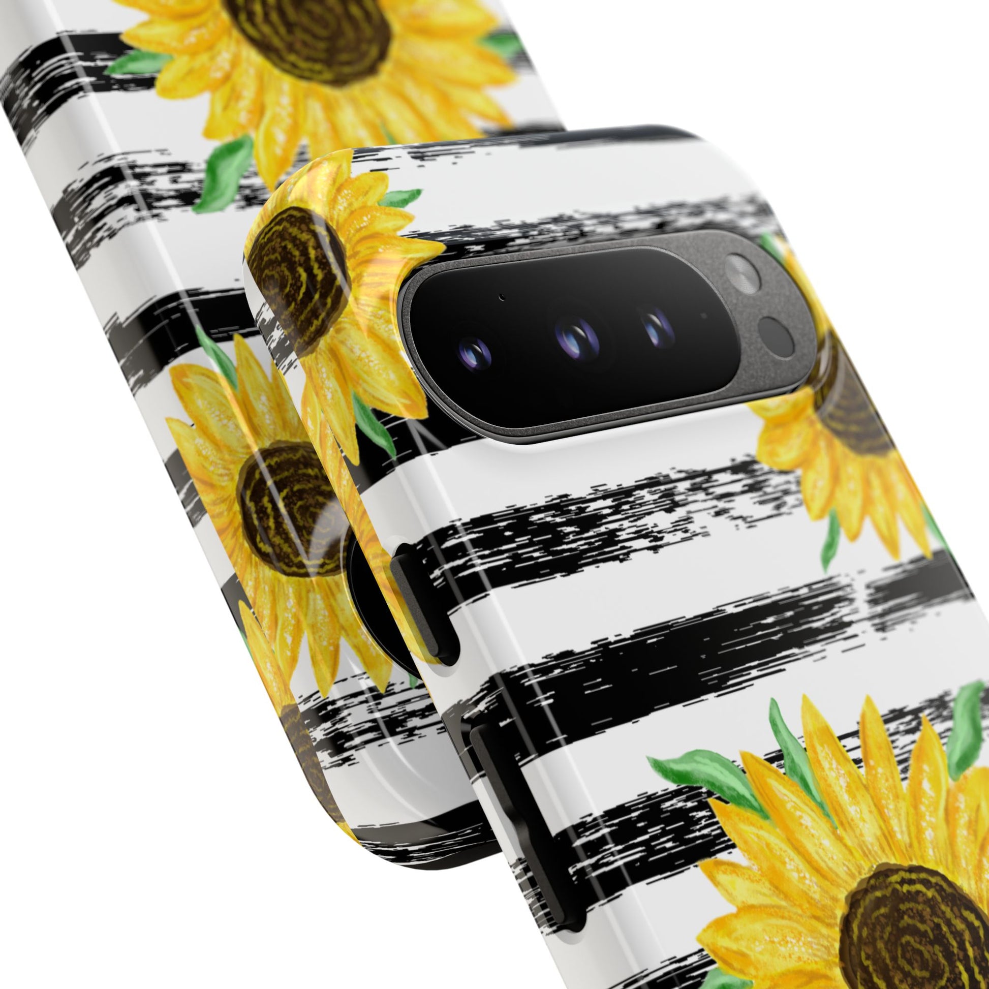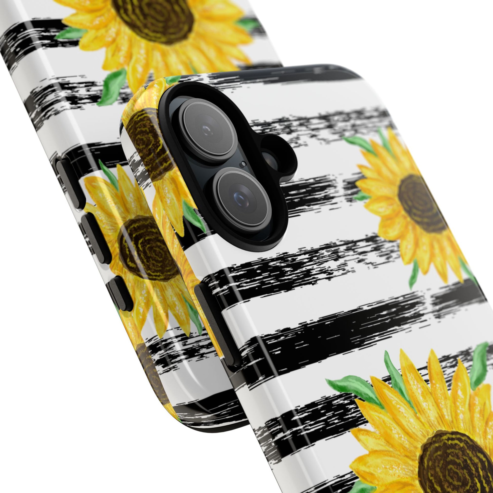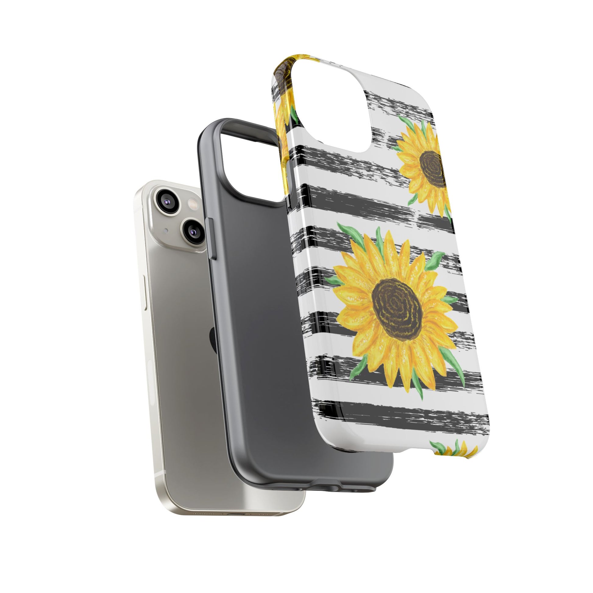 Sunflower Tough Phone Case - Bright Yellow Floral Art, Black and White Striped Aesthetic, Compatible with iPhone, Galaxy, and Google Phones