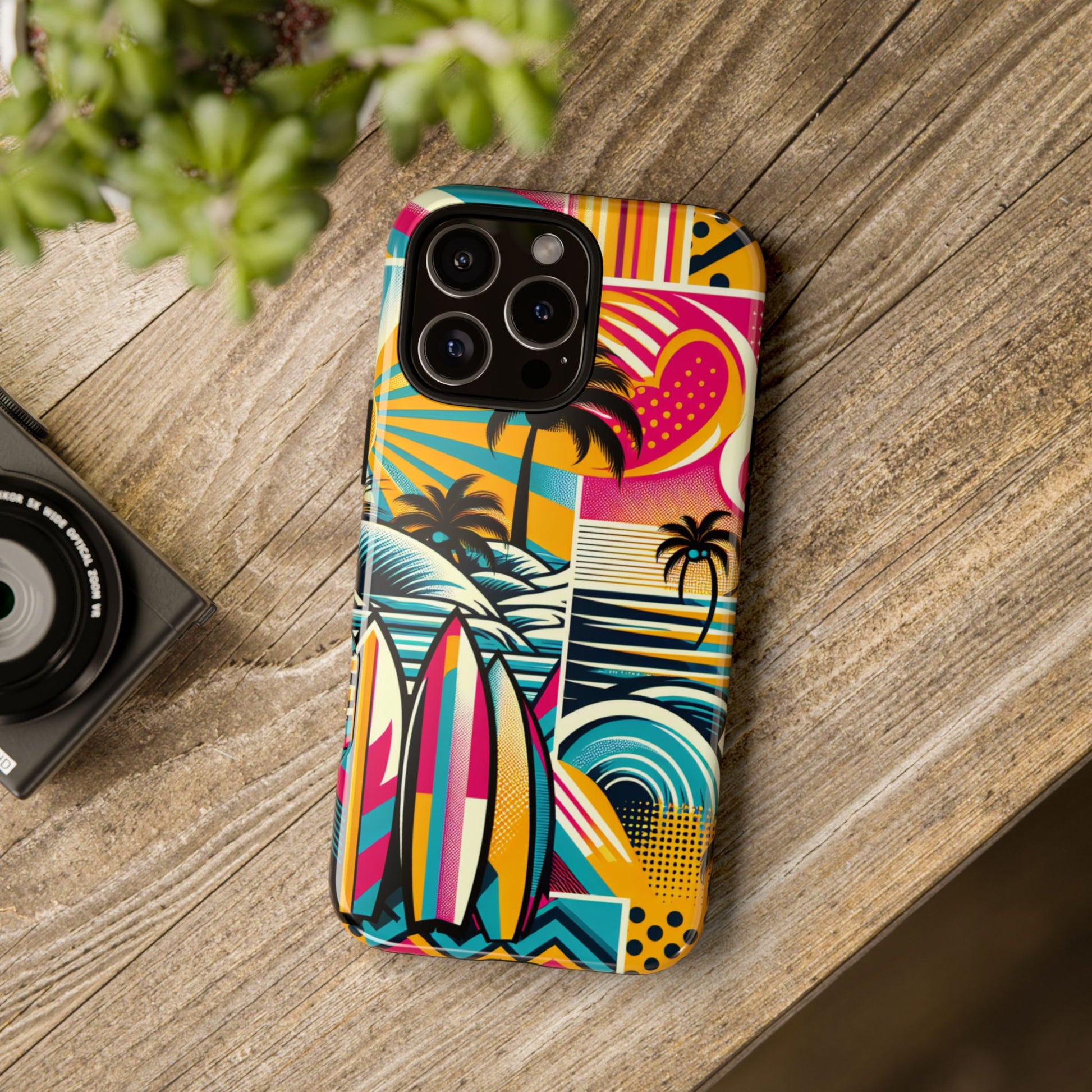 Catch the wave of style with our Surf Pop Phone Case! Featuring a colorful retro design with palm trees, surfboards, and beachy summer vibes, this case brings sunshine wherever you go. Whether you're a surfer, a beach lover, or just someone who craves coastal aesthetics, this protective cover is your perfect accessory.