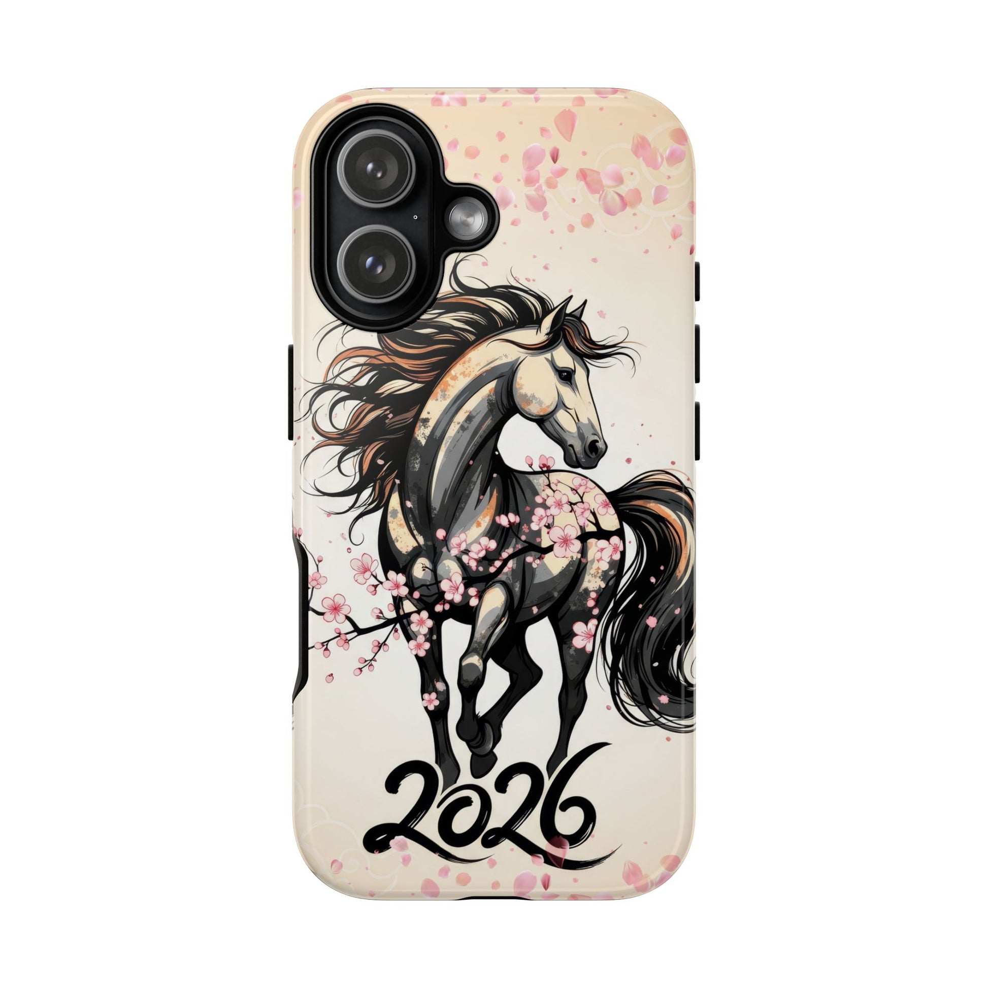 Year of the Horse Floral Art Tough Phone Case, Chinese Zodiac 2026 Design, compatible with iPhone 17 16 15 14 13 Galaxy Google