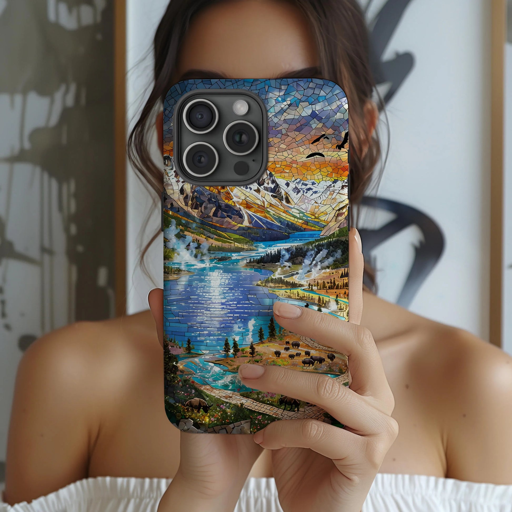 Yellowstone National Park Tough Case, Mosaic Landscape Phone Case, Scenic Wildlife Phone Cover Compatible with iPhone, Galaxy and Google